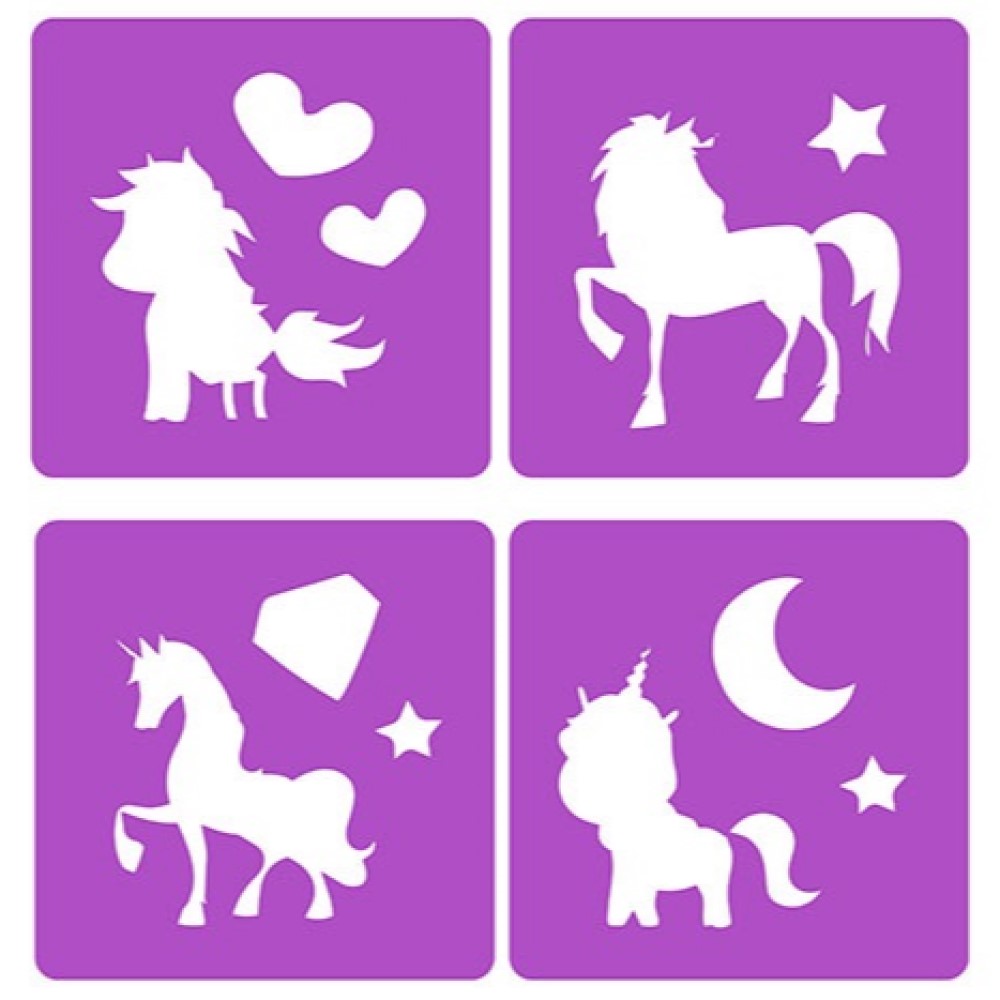 Dieses Set enthält sechs Kinderkreidestücke und vier bezaubernde Einhorn-Schablonen.