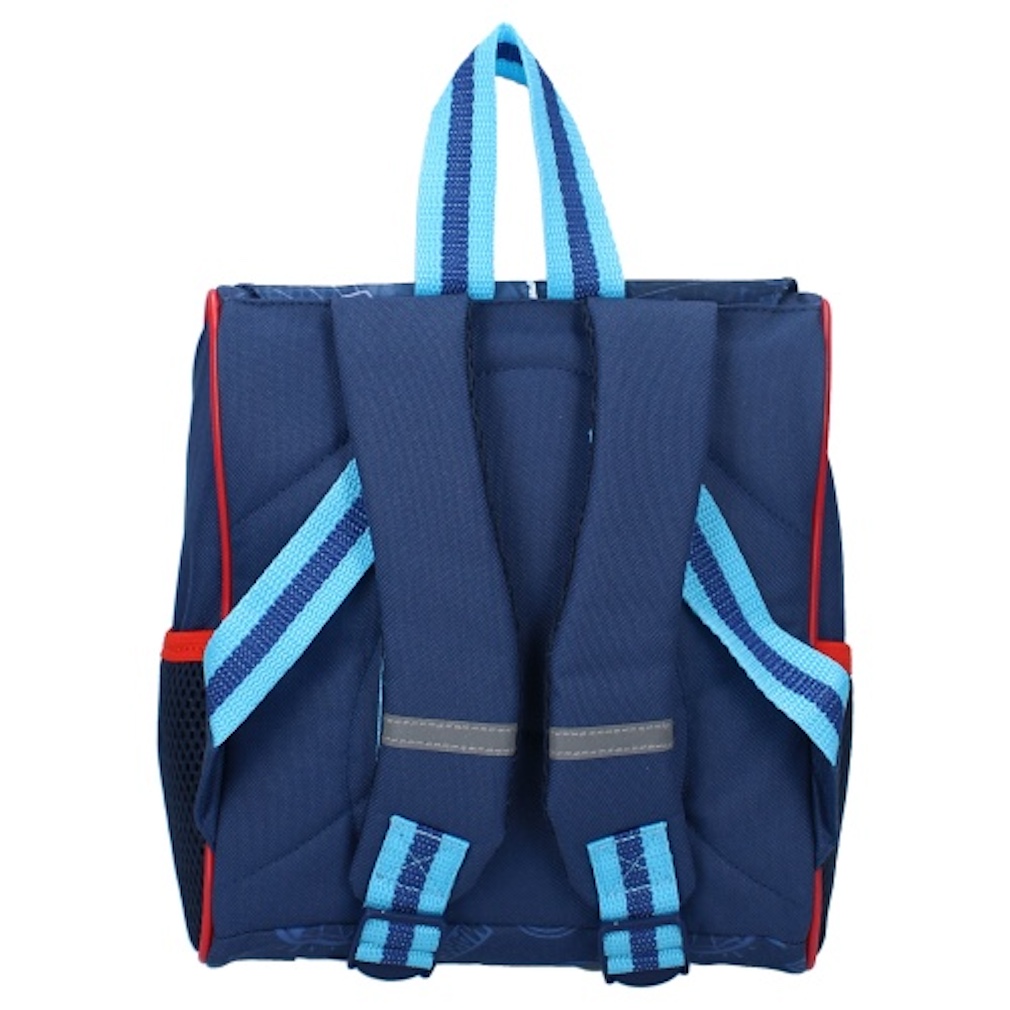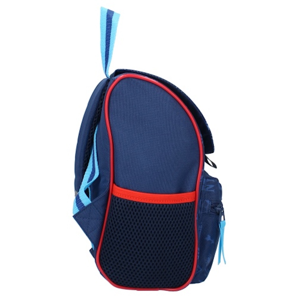 Das Hauptfach des Rucksacks ist geschickt hinter einer Frontklappe mit Klettverschluss versteckt, was nicht nur den Inhalt schützt, sondern auch einen einfachen Zugang ermöglicht. Die Rückwand ist verstärkt, um eine optimale Formstabilität zu gewährleisten, und die Fronttasche sowie die beiden Seitentaschen bieten zusätzlichen Stauraum für kleine Utensilien. Damit Ihr kleiner Held den Rucksack immer bequem tragen kann, sind die Schultergurte gepolstert und in der Länge verstellbar.