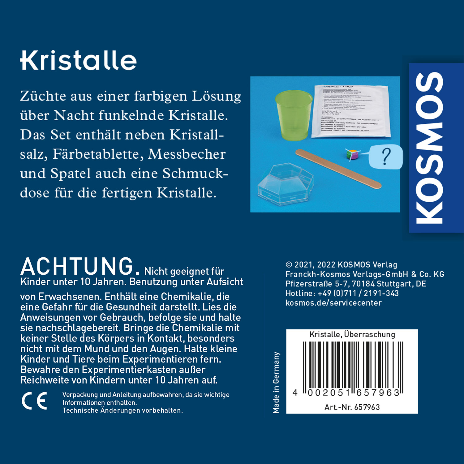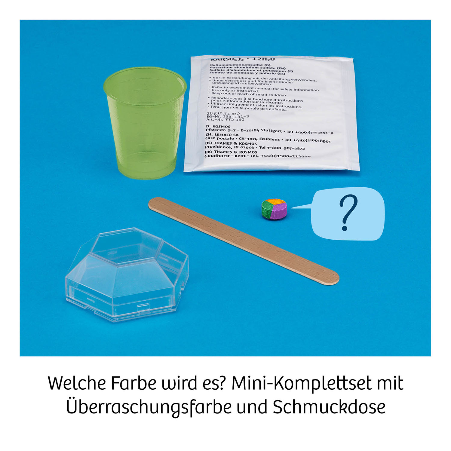 In der leicht verständlichen farbigen Anleitung wird Schritt für Schritt erklärt, wie die Kristalle gezüchtet werden. Spannende Experimente erleben – funkelnde Kristalle in einer Überraschungsfarbe selber züchten. Mit einer der drei Farben: Violett, Türkis oder Orange. Schnelle Ergebnisse garantieren Forscher-Spaß: Kristallwachstum über Nacht. Komplette Ausstattung zum Züchten inkl. kleiner Schmuckdose zum Aufbewahren und Präsentieren der Kristalle. Experimente mit Lösungen – Kinder entdecken spielerisch Chemie. KOSMOS Experimentierkasten für Kinder ab 10 Jahren.