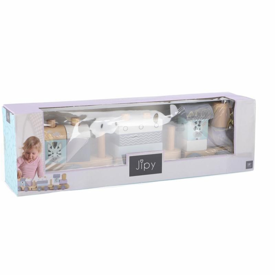 Dieses Set enthält eine Lokomotive und 2 Waggons, jeweils mit 2 Holzstiften zum Stapeln von Blöcken. Zusätzlich sind 15 Holzbausteine im Set enthalten.
