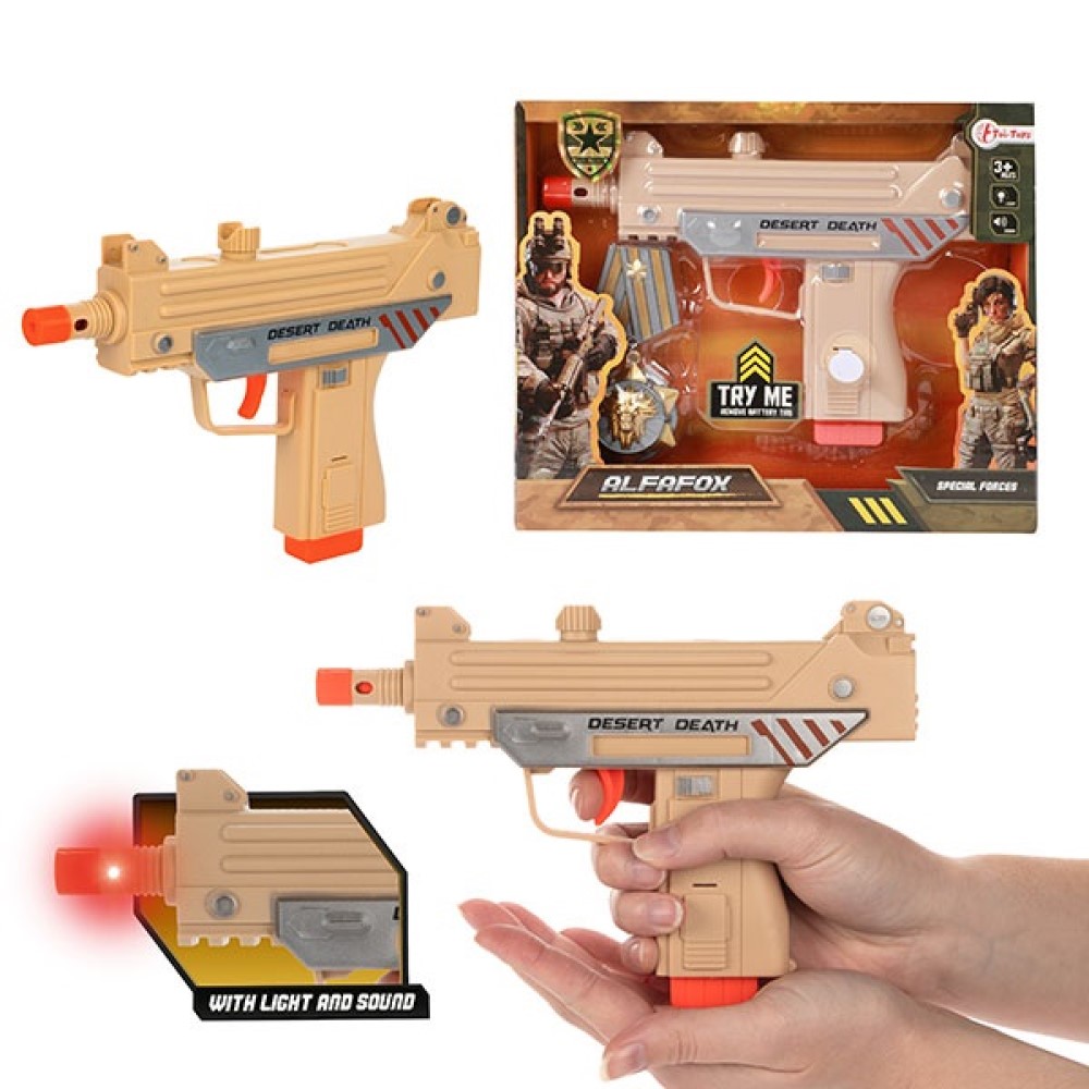 Mit der sandfarbenen Pistole, die leuchtet und Geräusche macht, kannst du dich verteidigen. Das Abzeichen zeigt, dass du ein echter Soldat bist, bereit für den Feind.