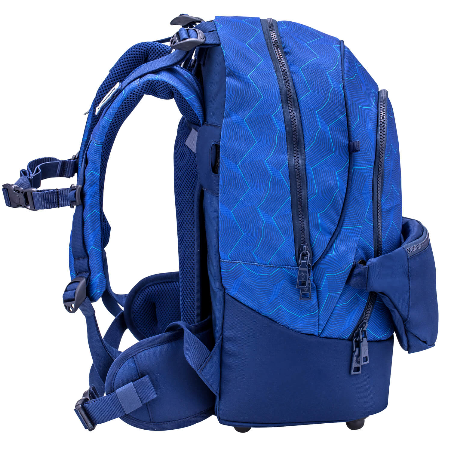 – Ein Beckengurt/Hüftgurt mit weich gepolsterten Beckenflossen sowie ein längen- und höhenverstellbarer Brustgurt fixieren den Schulrucksack sicher am Körper