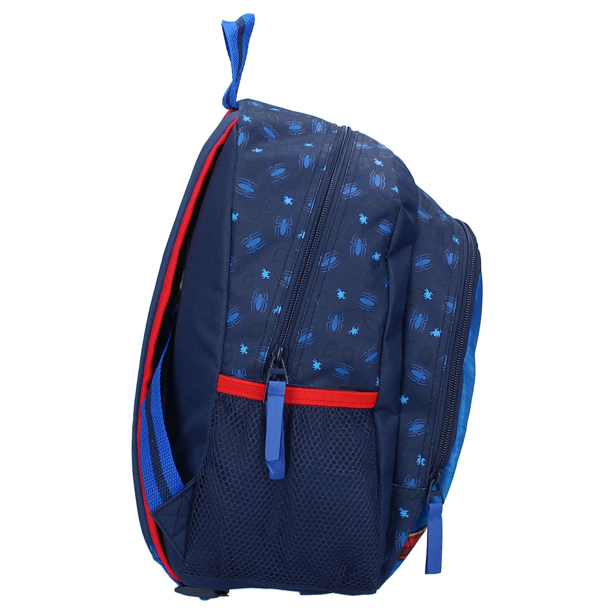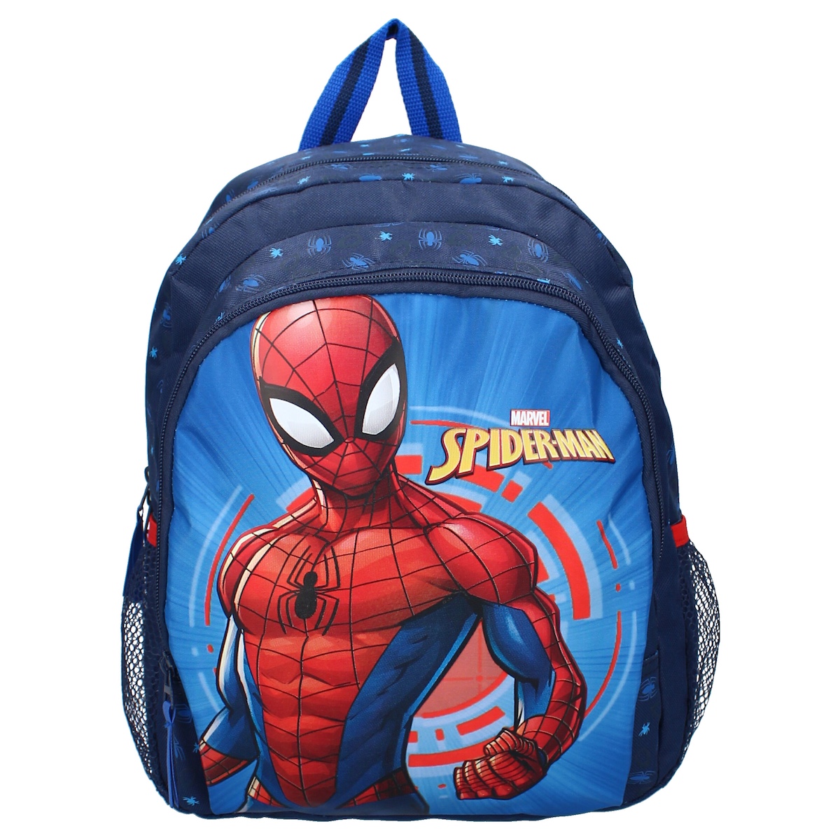 Spider-Man ist in einer coolen Pose auf der großen Vordertasche abgebildet, während kleine Spinnen den Rucksack zieren, um den Look des beliebten Superhelden abzurunden.