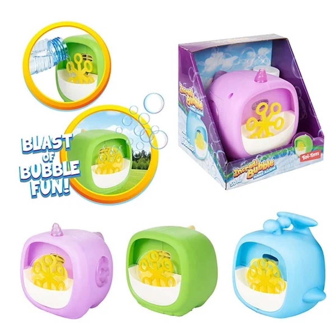 Unsere Seifenblasenmaschine ist in drei entzückenden Varianten erhältlich, die jedes Kinderherz höher schlagen lassen.