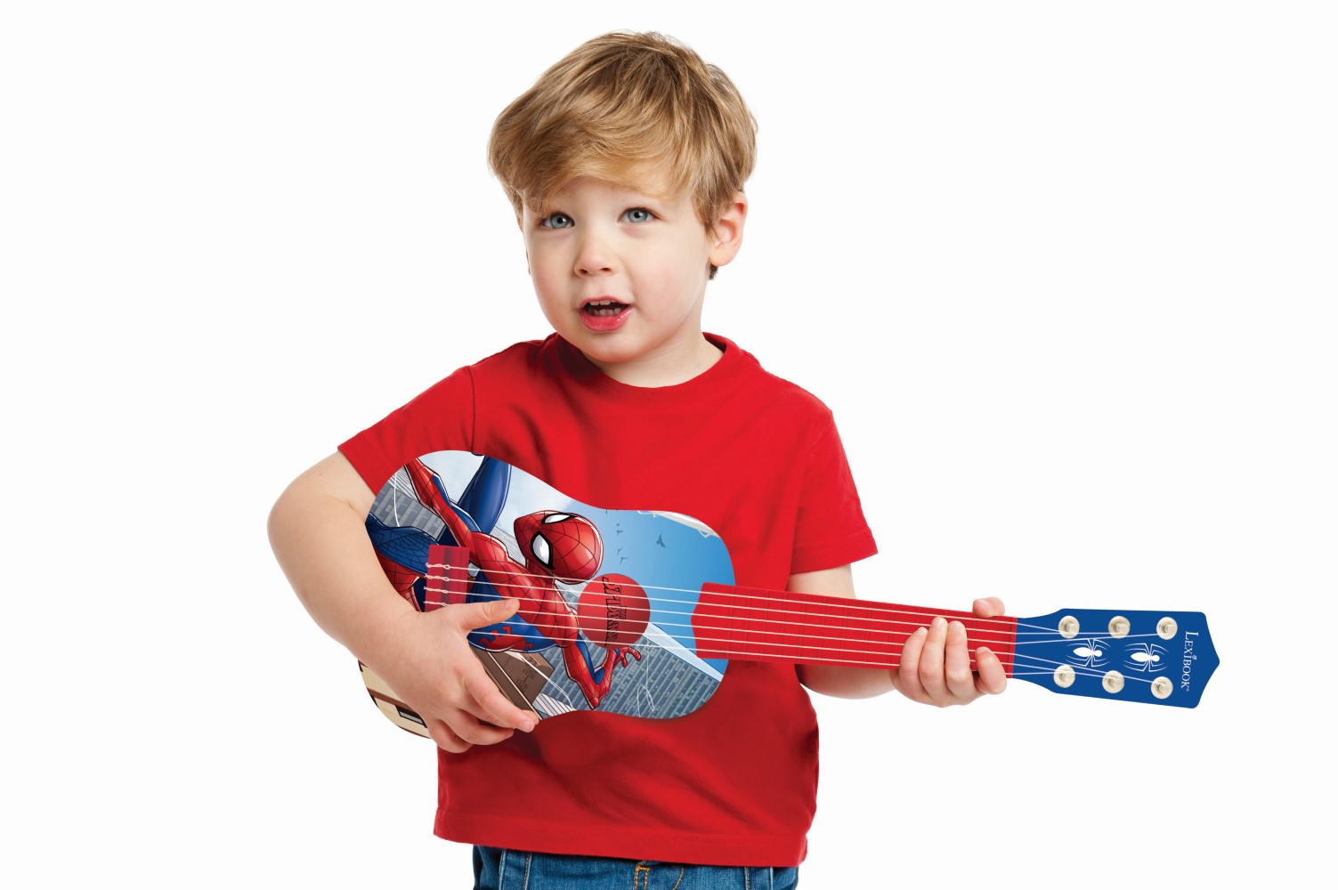 Kleine Spiderman Gitarre mit einem sehr schönen Spiderman Design. Produkt optimal nutzbar um Musik zu entdecken und dabei Spaß zu haben. Nutzung auch gut für den ersten Gitarrenunterricht geeignet. Produktgröße von ca. 53cm (L). Material aus Plastik mit 6 Nylonschnüren. Stimmen der Gitarre individuell möglich (Stimmgerät nicht im Lieferumfang enthalten).