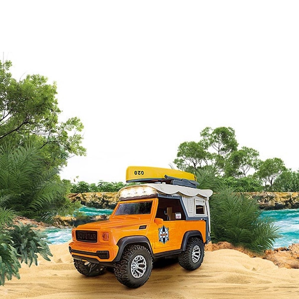Der robuste Jeep mit Dachzelt und das Kanu bieten stundenlangen Spielspaß und regen die Fantasie der Kinder an.