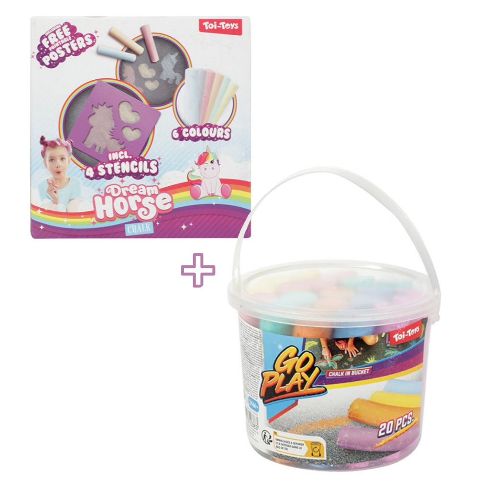 Unser Set enthält einen Eimer mit 20 bunten Kreidestücken und dazu wunderschöne Einhorn-Schablonen mit 6 zusätzlichen Kreidestücken. Erschaffe kunstvolle Meisterwerke auf dem Bürgersteig oder auf der Tafel.