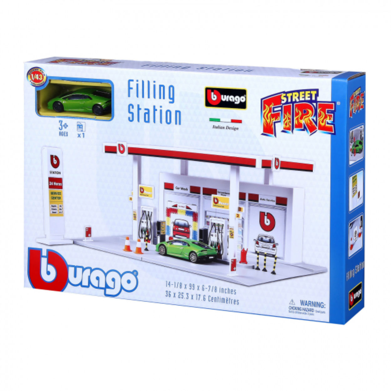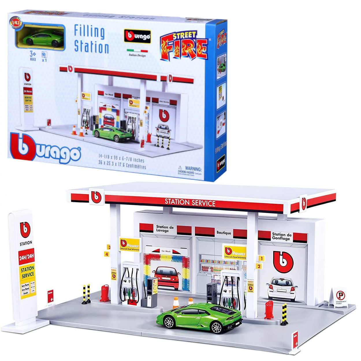 Mit diesem Bburago StreetFire Playset können Ihre Spielzeugautos einen kurzen Boxenstopp einlegen, um aufzutanken oder sich mit Snacks zu versorgen, bevor sie wieder auf die Straße gehen.