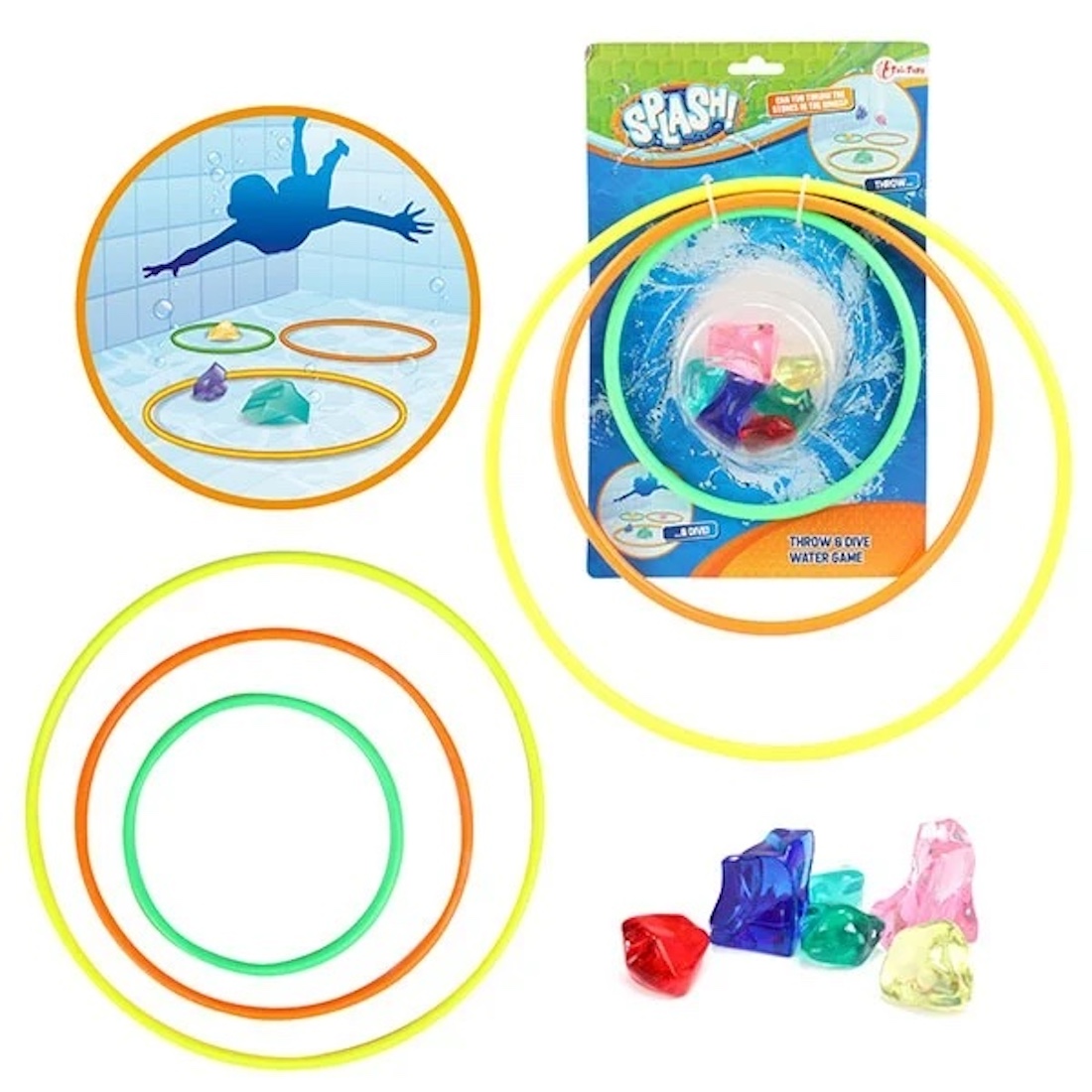 Unser Set enthält drei bunte Ringe und sechs faszinierende Steine, die für stundenlange Unterwasserunterhaltung sorgen.