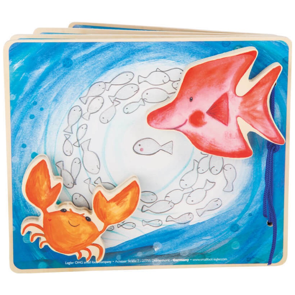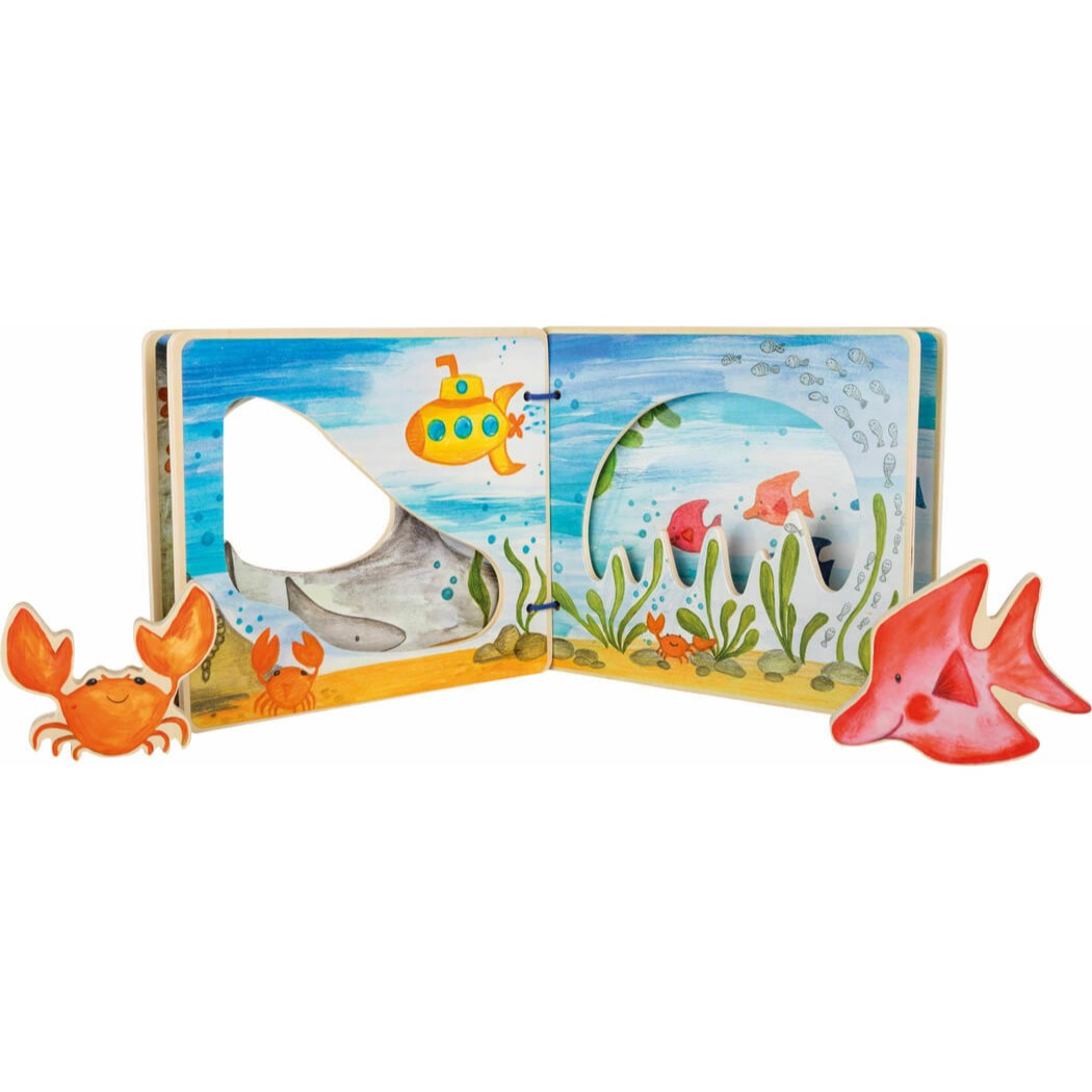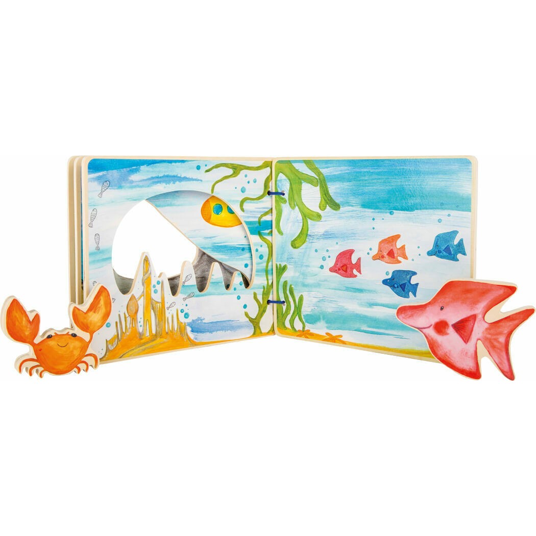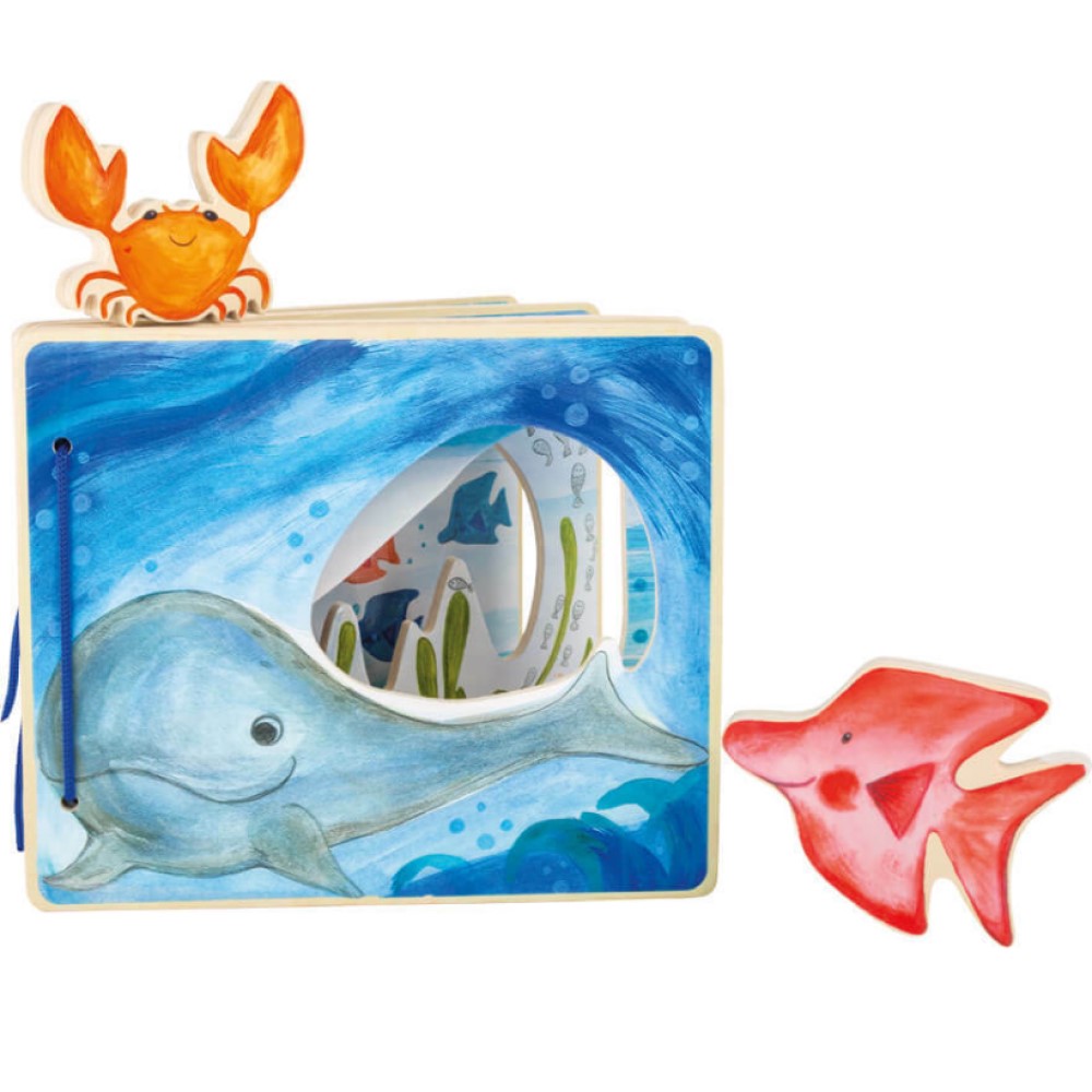 Mit diesem interaktiven Bilderbuch aus Holz entdecken Kinder spielerisch die Welt der Meeresbewohner.