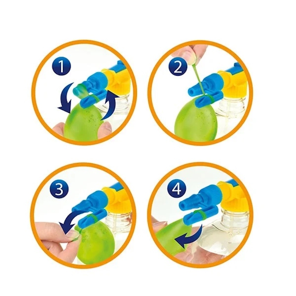 Einfach die Wasserbomben aufstecken, die Pumpe betätigen und in Sekundenschnelle sind die Bomben bereit für den Einsatz.
